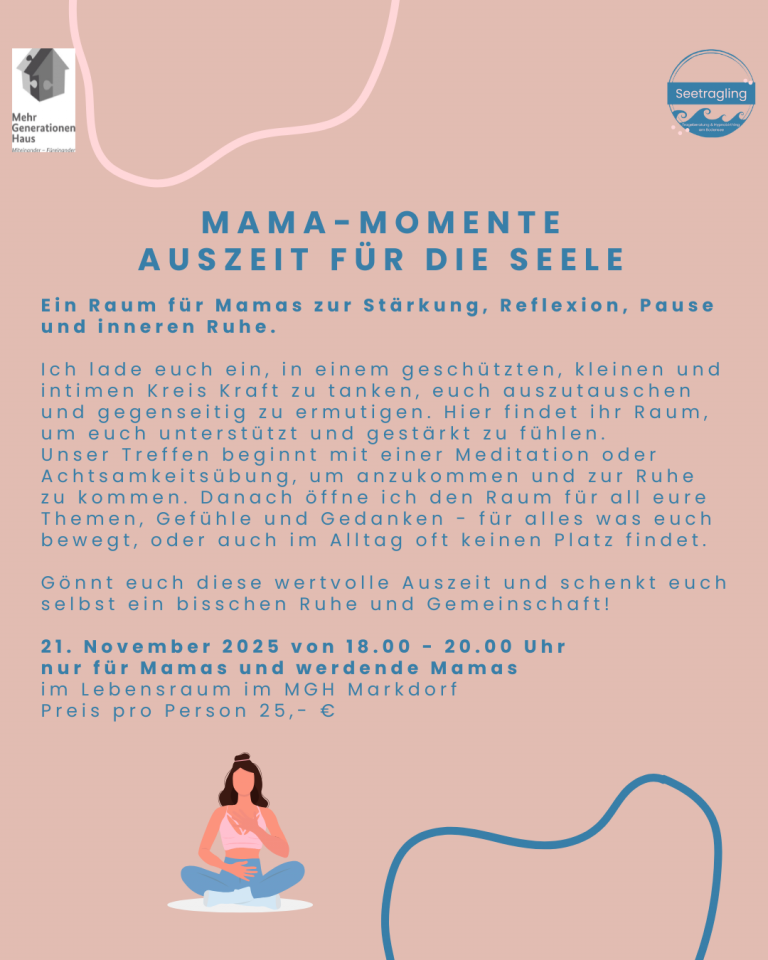 Einmal im Monat biete ich Mama Momente – eine Art Gesprächskreis, Frauenkreis oder auch Womencircle genannt an. Ein Raum für Mamas zur Stärkung, Reflexion, Pause und inneren Ruhe. Ich lade euch ein, in einem geschützten, kleinen und intimen Kreis Kraft zu tanken, euch auszutauschen und gegenseitig zu ermutigen. Gemeinsam starten wir mit einer Meditation oder Achtsamkeitsübung und dann biete ich den Raum für alle Themen die euch beschäftigen, bewegen, erfreuen, besorgen, entmutigen oder ermutigen. Alles bleibt im Raum, für alles gibt es Raum. Reden, zuhören, schweigen, gemeinsam lachen oder weinen. Gönnt euch diese Auszeit, nur für euch. Anmeldung unter hello@seetragling.de oder unter Kikudoo